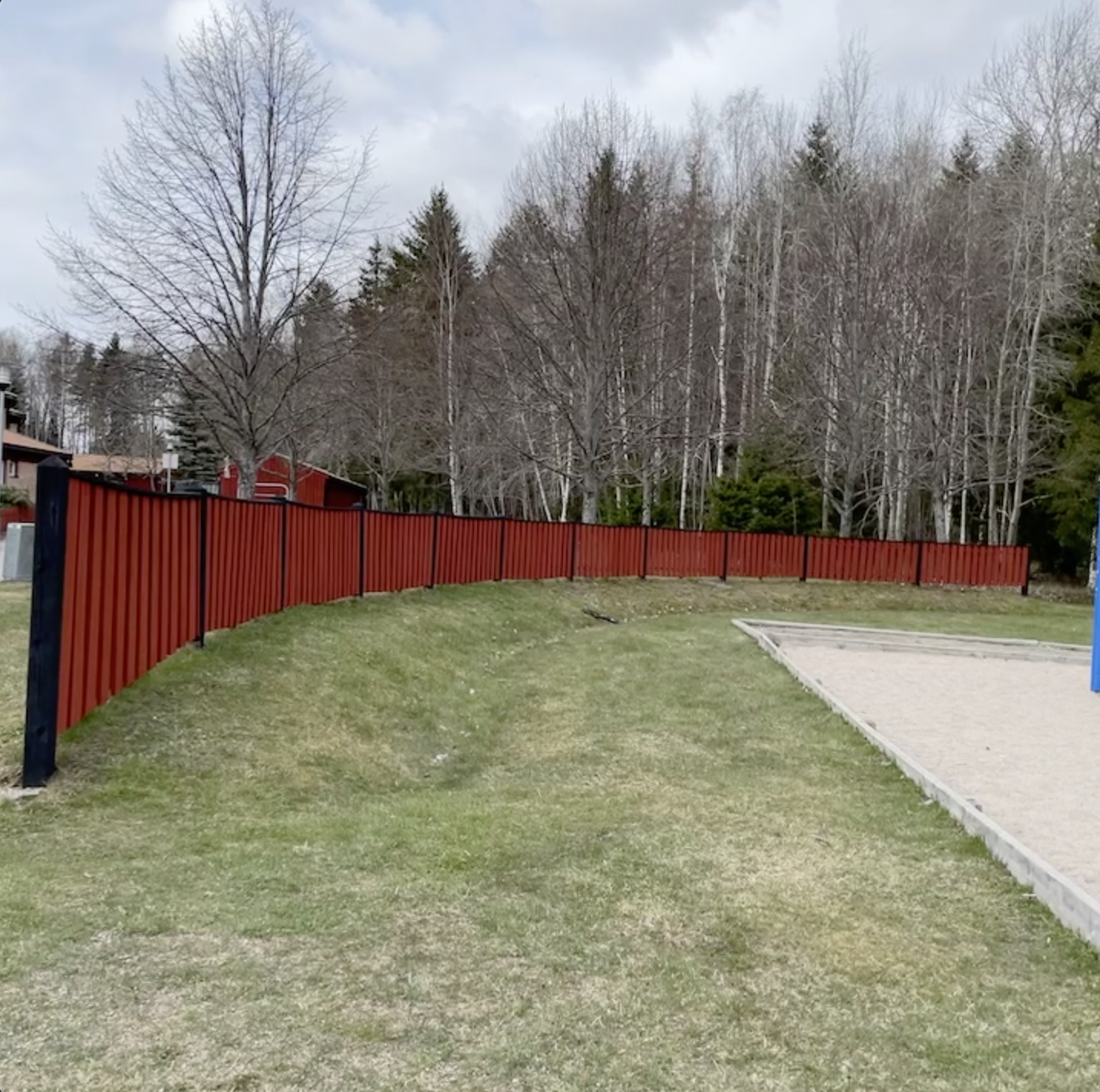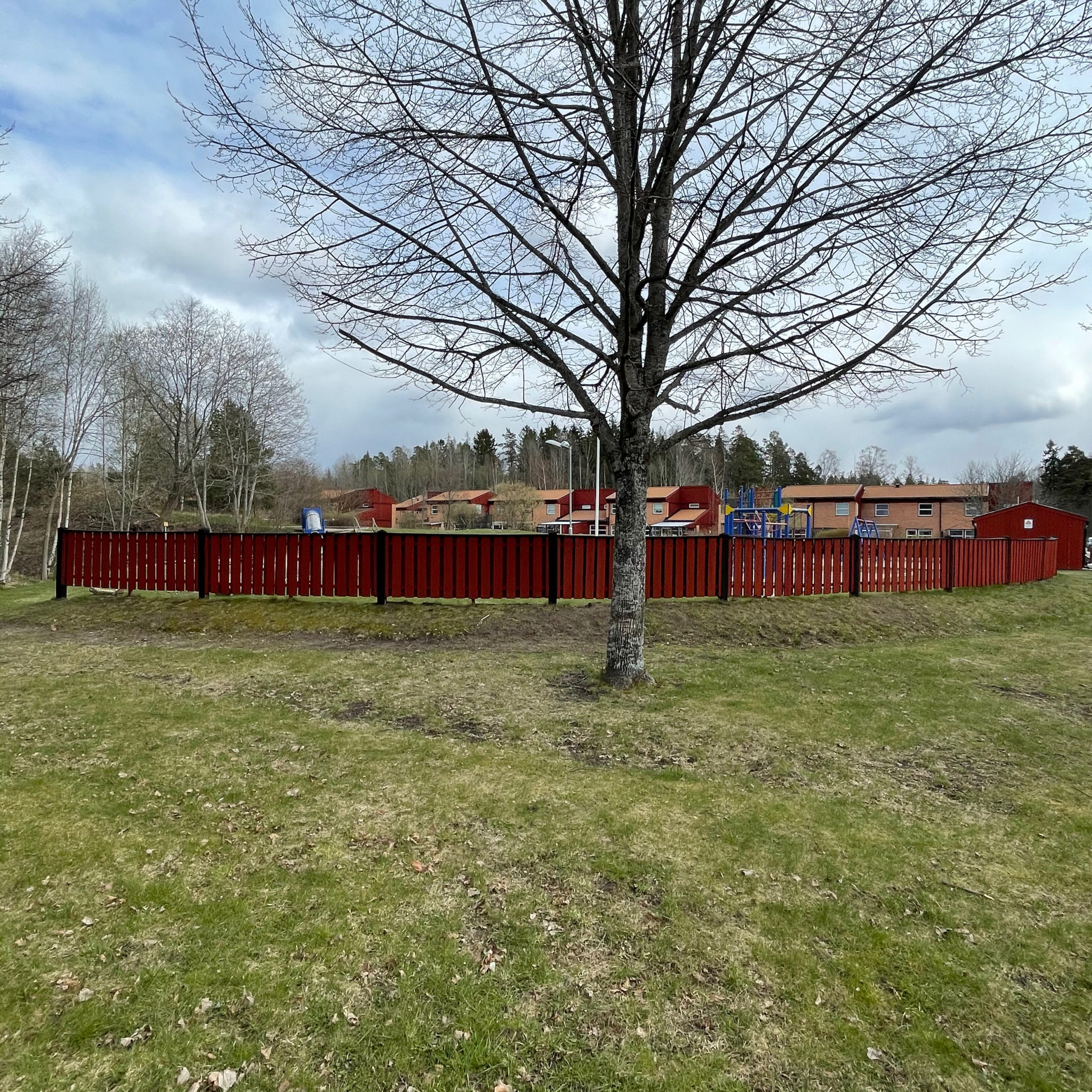 Färdigmålat plank vid stora lekplatsen.