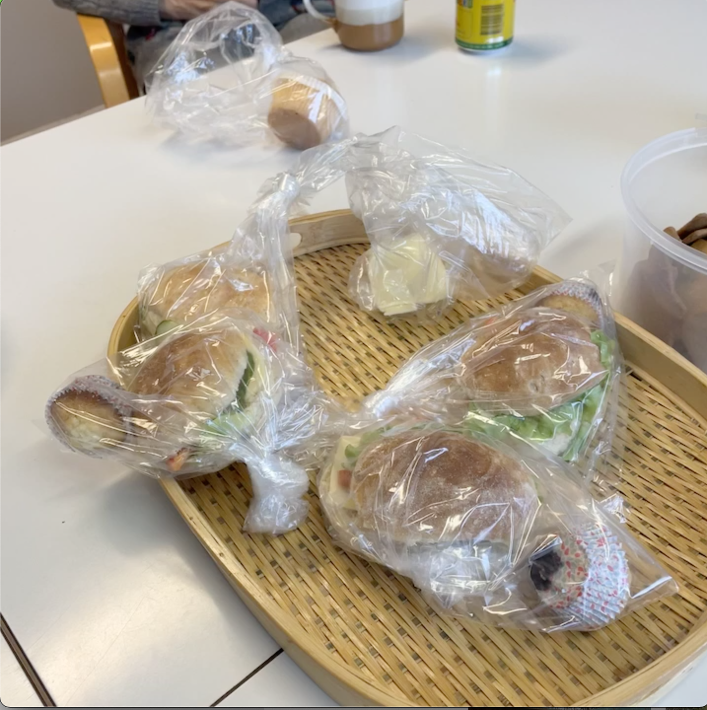 Det bjöds på mackor med hembakat bröd och dricka, och mini-muffins med blåbär. Till hjälpsamma barn fanns det godis och läsk. Brödet och muffins (med blåbär) var hembakade (tack Monica).